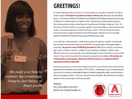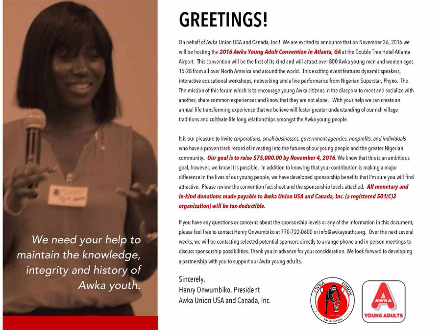 Awka Young Adults accepts sponsorships and donations from corporations, members and well-wishers.